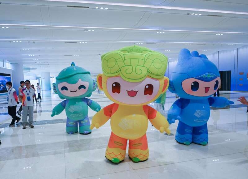 9月1日,亚运会吉祥物“琮琮”“莲莲”“宸宸”在主媒体中心与记者互动。新华社记者徐昱摄