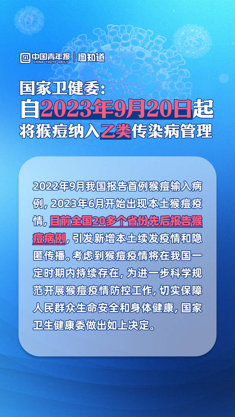 今年以来,我国已有20多个省份先后报告猴痘病例,引发新增本土续发疫情和隐匿传播。国家卫健委9月15日发布公告称,自2023年9月20日起将猴痘纳入乙类传染病进行管理,采取乙类传染病的预防、控制措施。