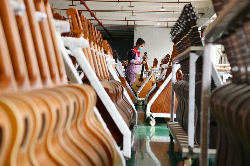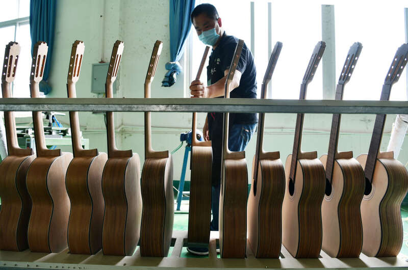 板材挑选、切割成型、拉装弦线、调音检测……经过200多道工序,一把把做工精美的吉他在中国贵州省的正安县诞生,随后通过中欧班列、水运等方式销往全球各地。