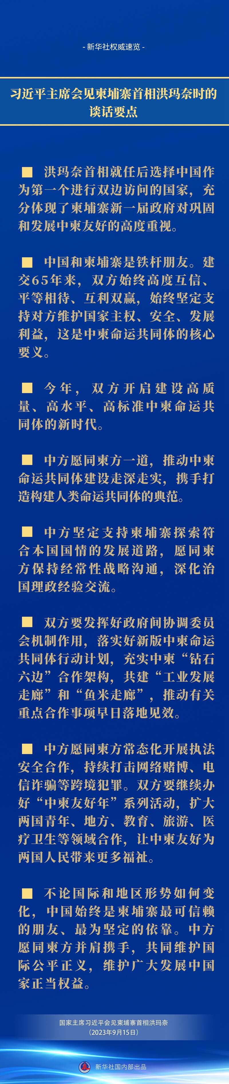 习近平主席会见柬埔寨首相洪玛奈时的谈话要点