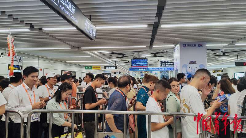 9月16日,广西南宁,不少东博会参展商和观众正在地铁1号线会展中心站排队安检。中青报·中青网见习记者 王军利/摄