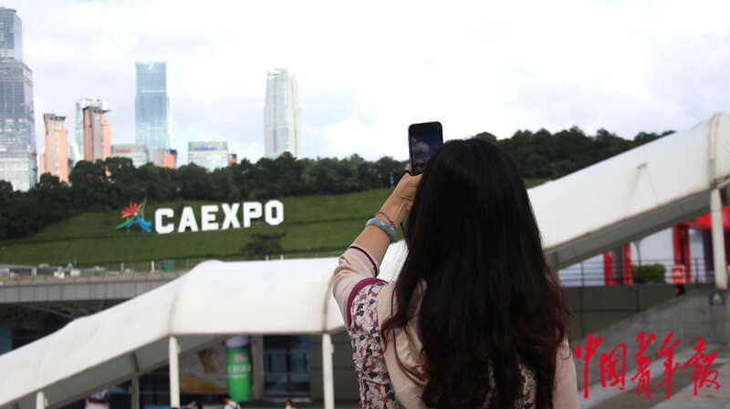 9月16日,广西南宁国际会展中心,一名东博会参展商正对着远处“CAEXPO”的标识拍照留念。中青报·中青网见习记者 王军利/摄