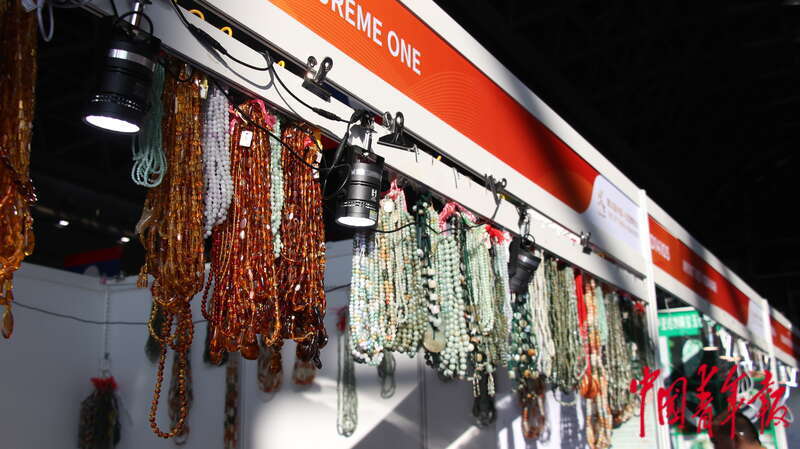 9月16日,广西南宁国际会展中心东博会东盟国家商品展区,一家摊位上挂着手串和项链。中青报·中青网见习记者 王军利/摄