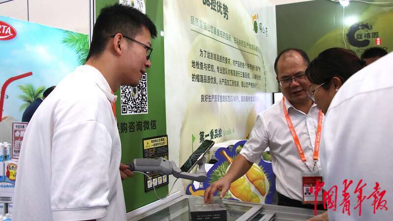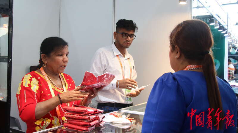 9月16日,广西南宁国际会展中心东博会东盟国家商品展区,三名参展商正在交流。中青报·中青网见习记者 王军利/摄