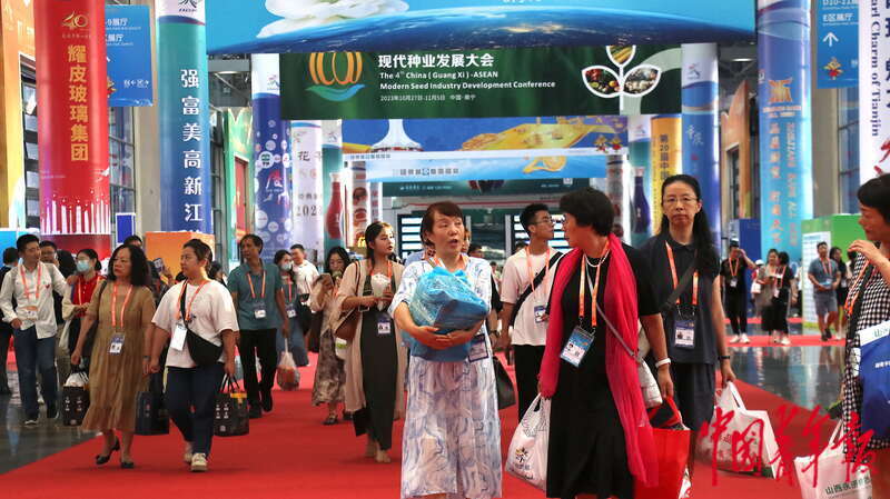 9月16日,广西南宁国际会展中心,不少观众手中提着刚刚在东博会上选购的特色产品。中青报·中青网见习记者 王军利/摄