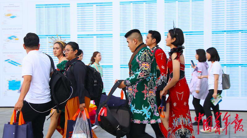 9月16日,广西南宁国际会展中心,身着东南亚特色服装的青年正从东博会D区展厅走出。中青报·中青网见习记者 王军利/摄
