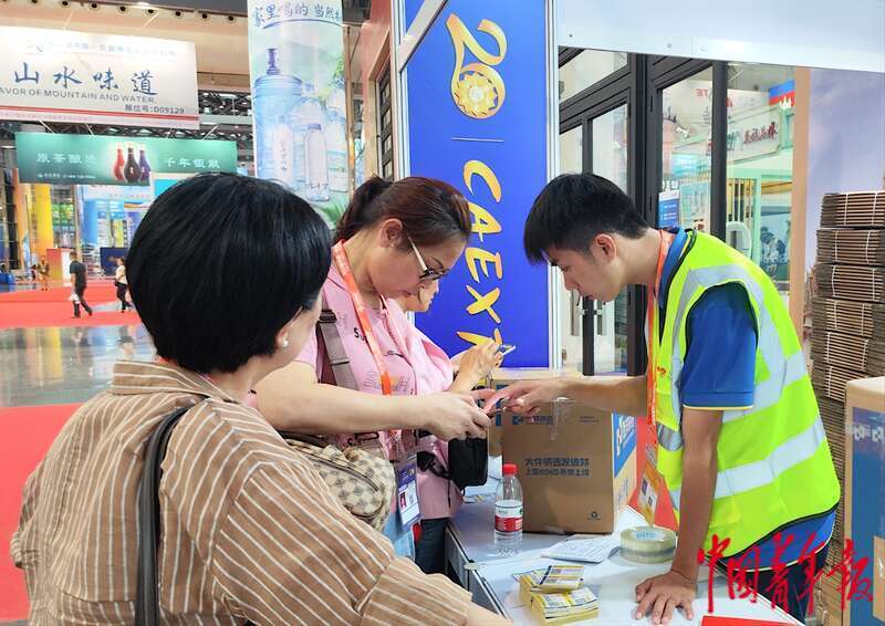 9月16日,广西南宁国际会展中心,两名来自广西柳州市的观众正在邮寄从东博会上采购的商品。当日下午,这个快递服务点已经揽收快递50箱。中青报·中青网见习记者 王军利/摄