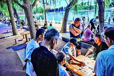 市民在北京什刹海边下棋。新华社发