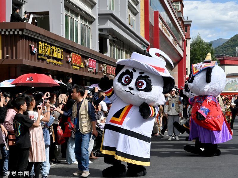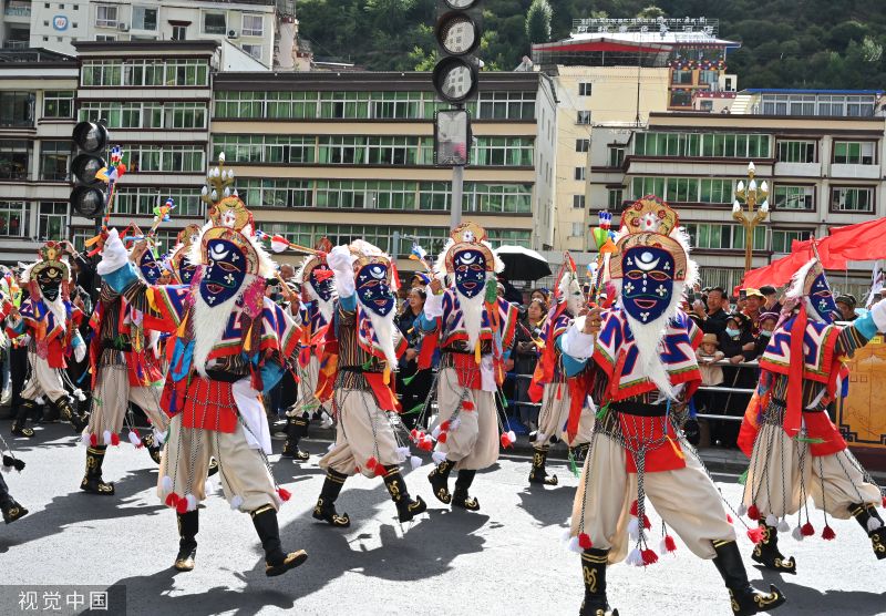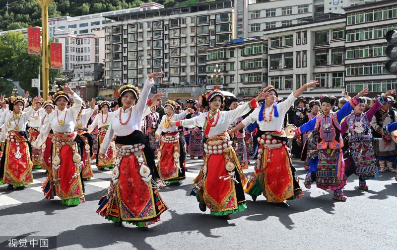 2023年9月15日下午,四川阿坝,喜迎建州70周年,马尔康市主城区举行大型非遗千人巡游活动。