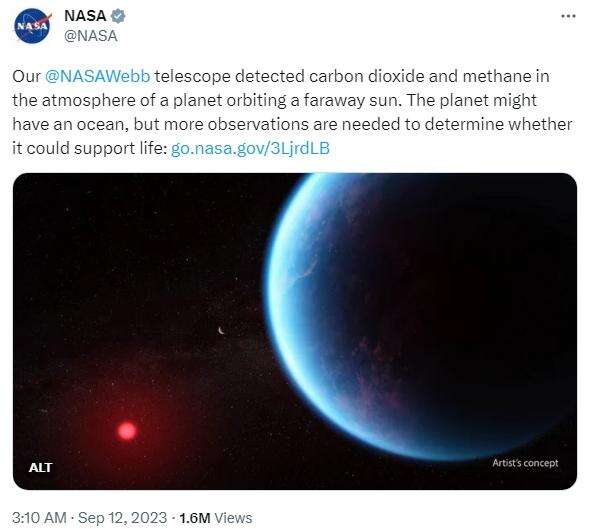 美国国家航空航天局(NASA)发布消息称,詹姆斯·韦伯太空望远镜最近在太阳系外的一颗行星上探测到了水、海洋表面和一种特定的化学物质。图片来源:NASA社交媒体截图