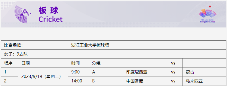 杭州亚运会板球项目比赛时间为9月19日-10月7日,在浙江工业大学(屏峰校区)板球场举行,共产生2枚金牌。