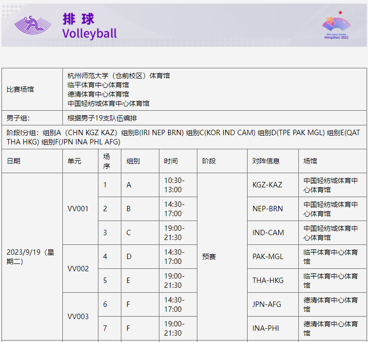 杭州亚运会排球项目比赛时间为9月19日-10月7日,在杭州师范大学(仓前校区)体育馆、德清体育中心体育馆、临平体育中心体育馆、中国轻纺城体育中心体育馆举行,决赛在杭州师范大学(仓前校区)体育馆和临平体育中心体育馆举行,共产生2枚金牌。