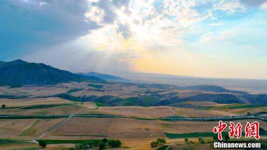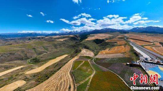 9月下旬的新疆江布拉克景区,进入了色彩最为丰富的季节,万亩麦田流光溢彩,勾勒出几何图形的大地版画,连绵不绝的金色麦田与远山相映,如同油画般的金色世界。图为航拍镜头下的新疆奇台县江布拉克景区进入了色彩最为丰富的季节。