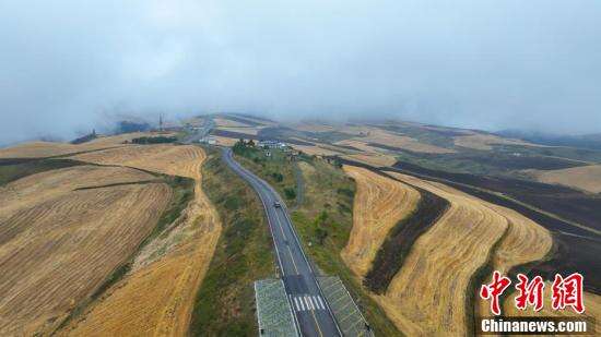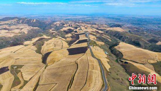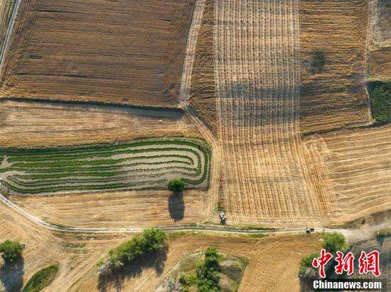 新疆奇台县江布拉克天山麦海收割完,留下巨型“线条画”。