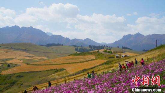 新疆奇台县江布拉克格桑花吸引游人驻足拍照。