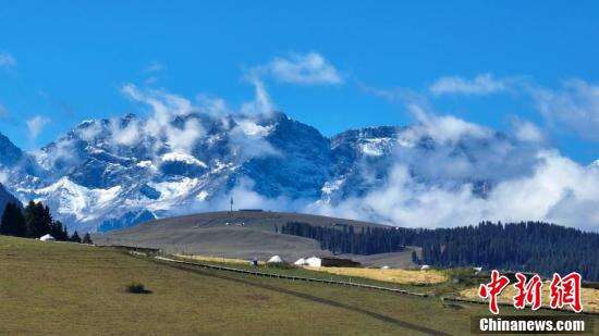 新疆奇台县江布拉克景区雪山与山丘、松柏构成一幅壮美画卷。