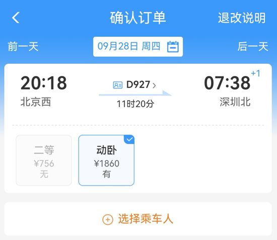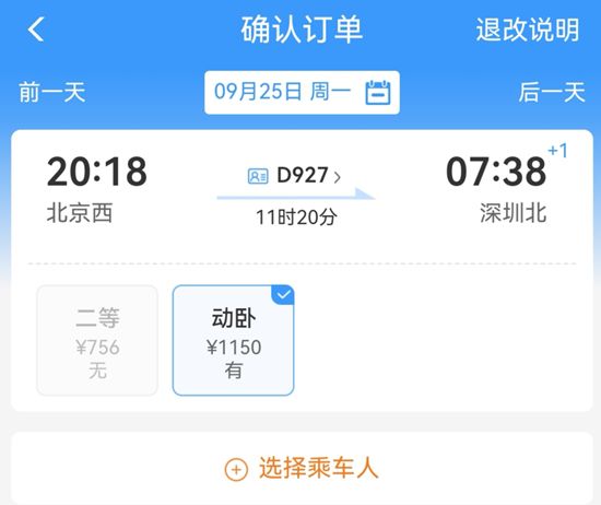 近日,有网友在社交媒体发文称,北京到深圳的D927卧铺,上铺平日1150元,但在9月28日(国庆假期前一日)价格涨到1860元,下铺动卧价格达到了2090元。