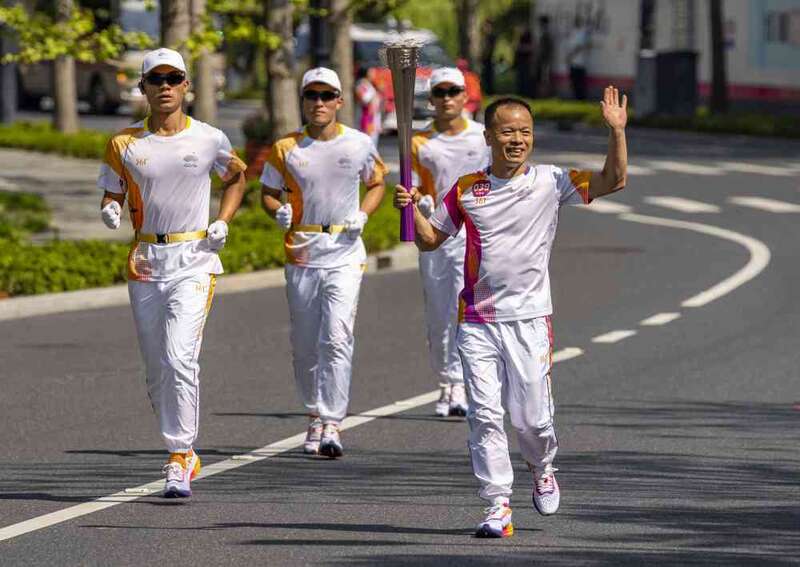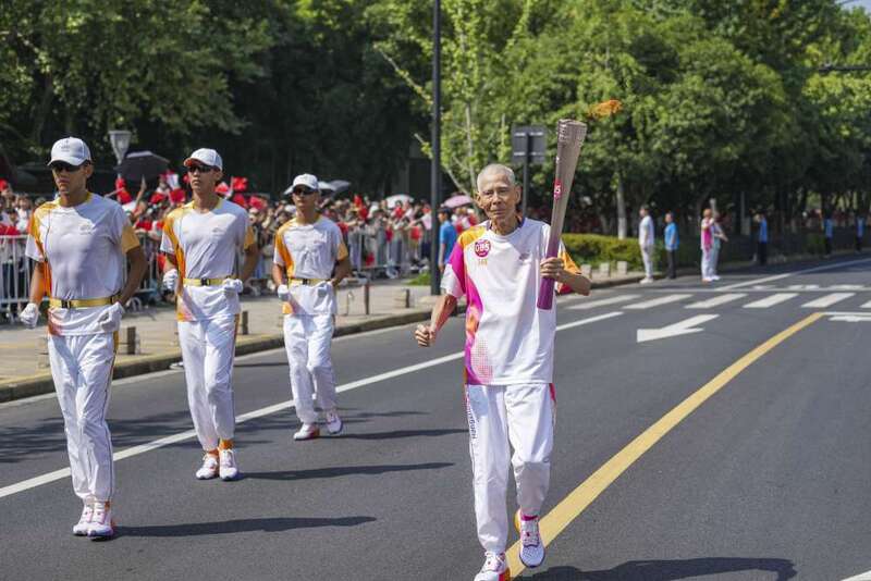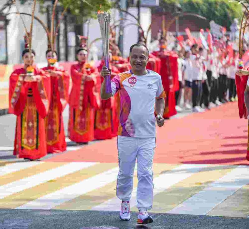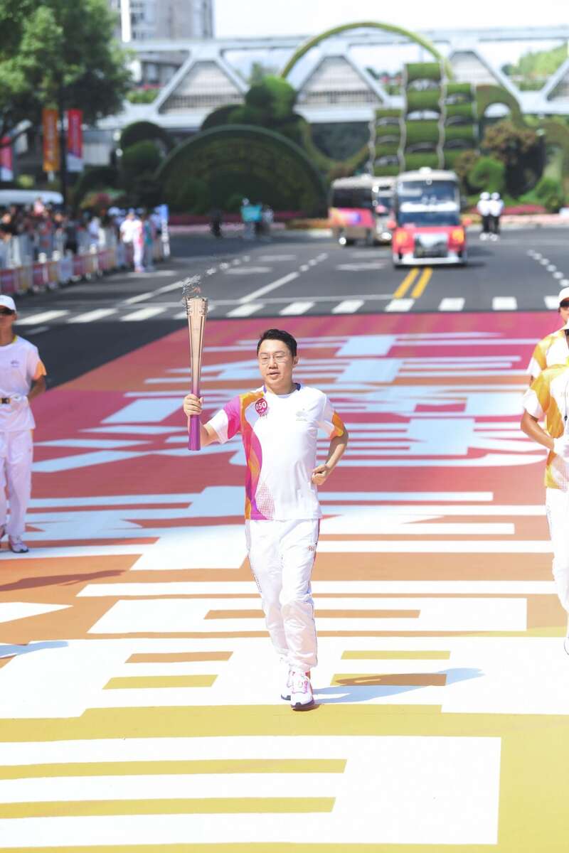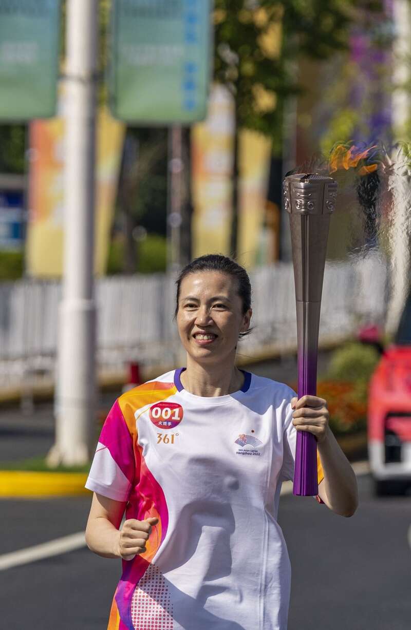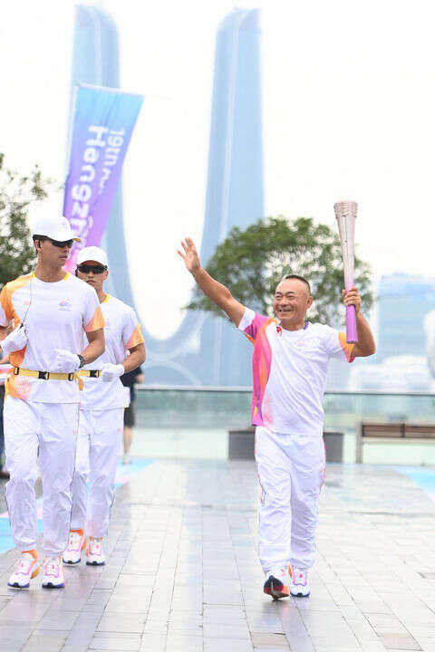 ↑火炬手李荣祥在杭州亚运会火炬传递湖州站收火仪式上。