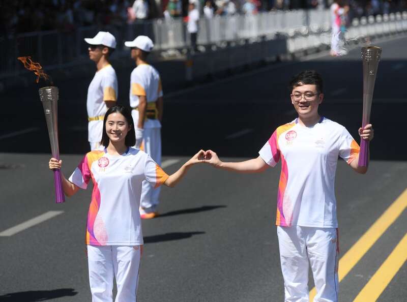 ↑火炬手王子震(右)和项珍珍在火炬传递中。