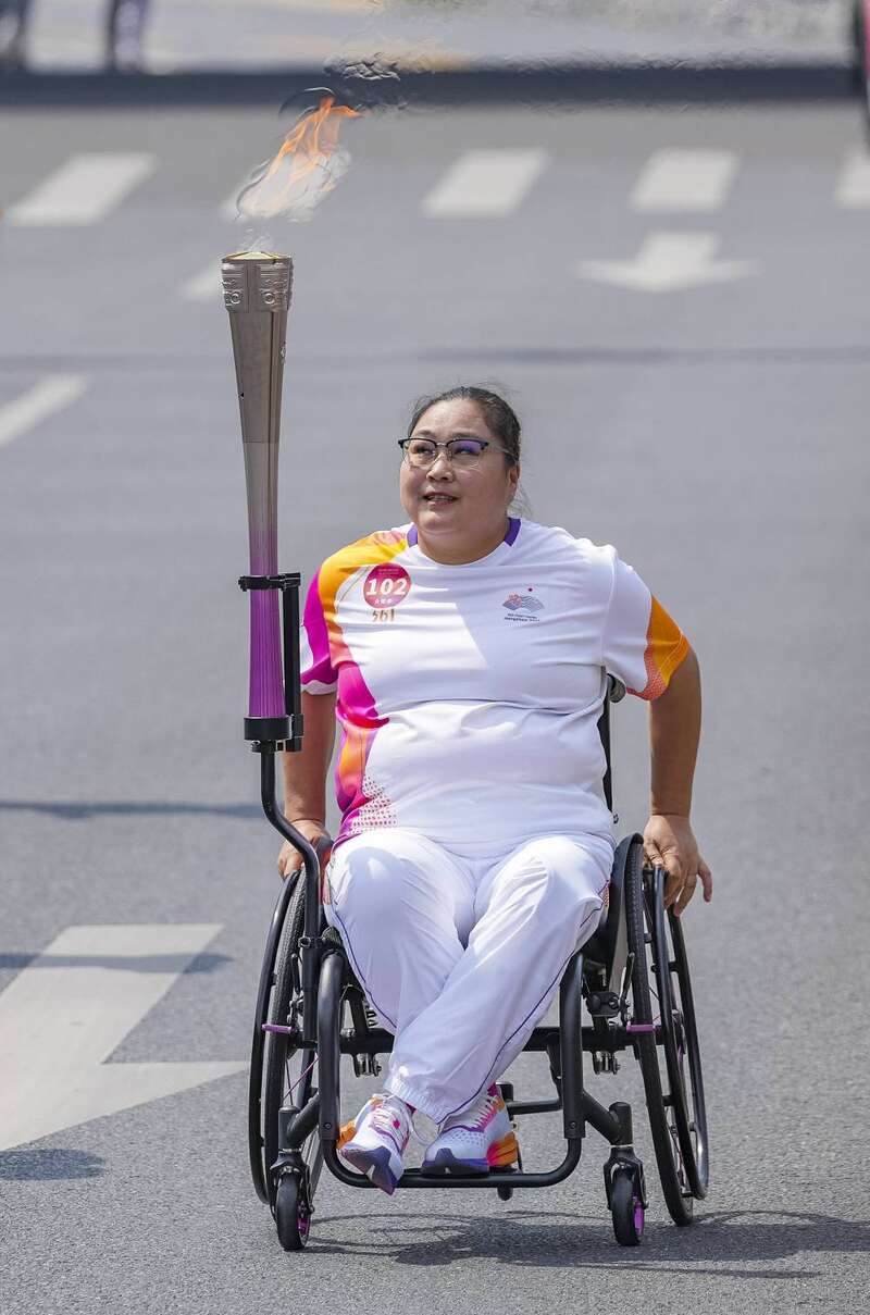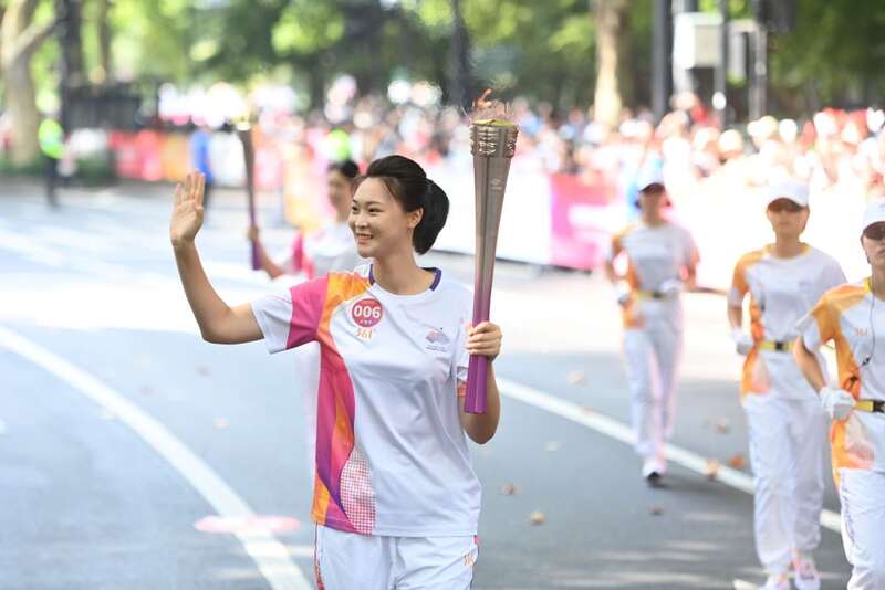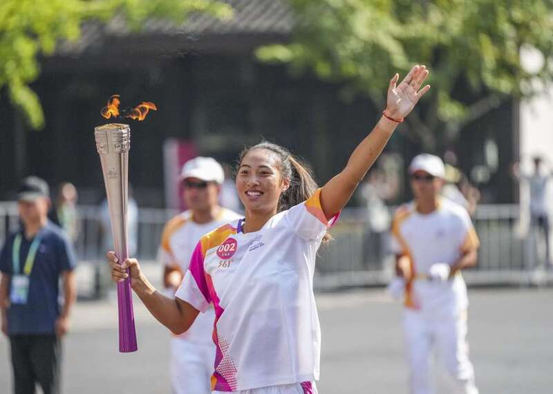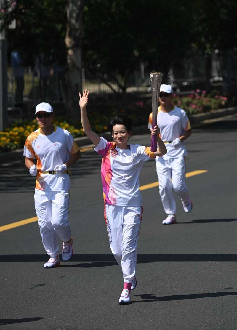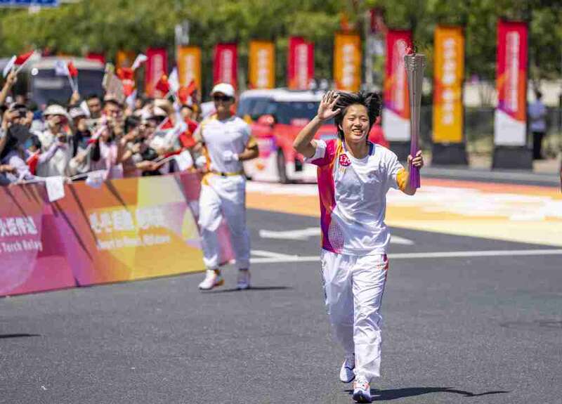 ↑火炬手司烨仪在火炬传递中。