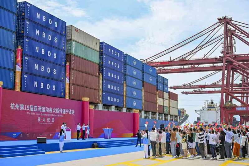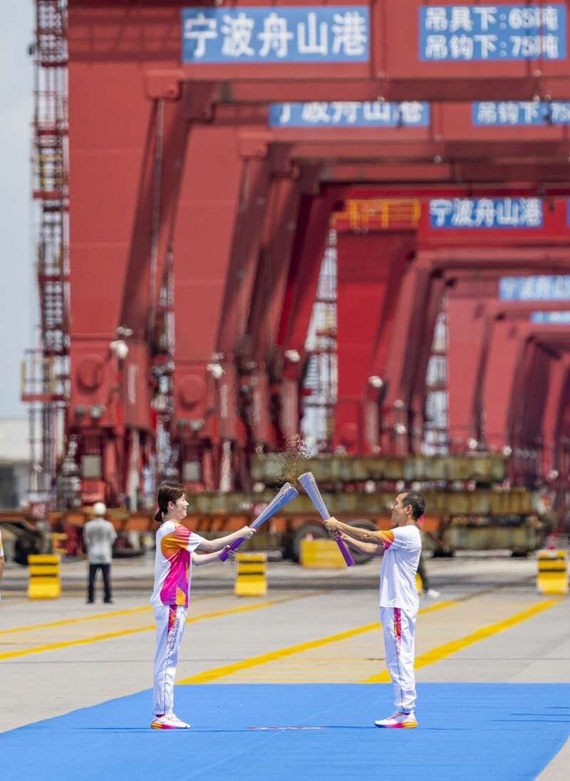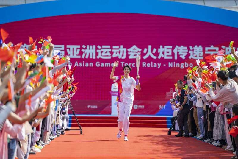 ↑这是杭州亚运会火炬传递宁波站起跑仪式现场。