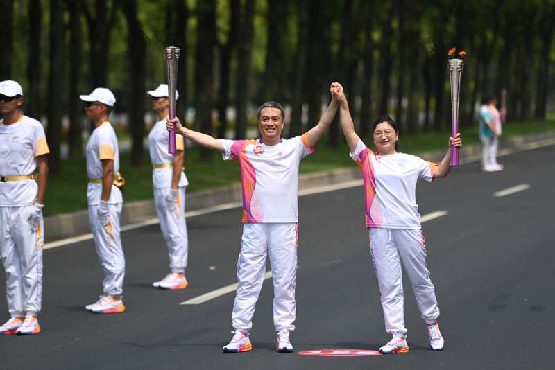 ↑火炬手葛庭辉(左)和章丽楠在火炬传递中。