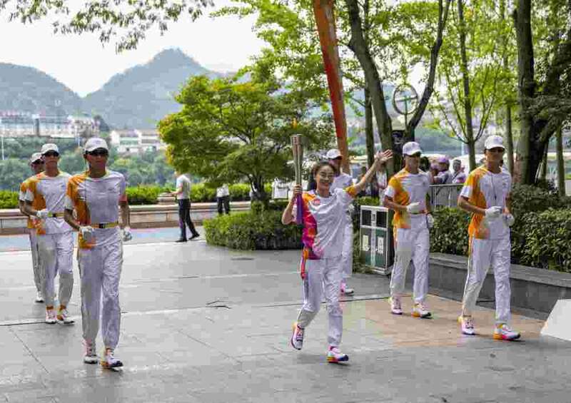 ↑火炬手钟天使在火炬传递中。