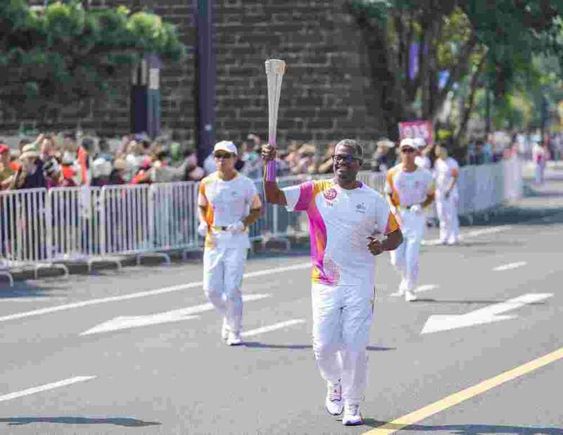 ↑火炬手曹荣安在火炬传递中。