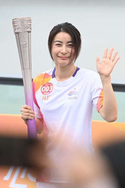 ↑火炬手郭晶晶在火炬传递前向观众致意。