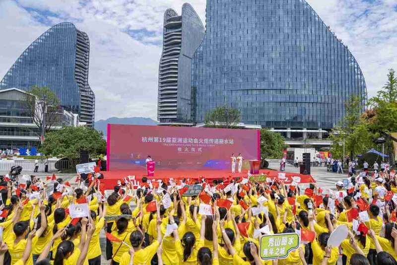 ↑这是杭州亚运会火炬传递丽水站收火仪式现场。