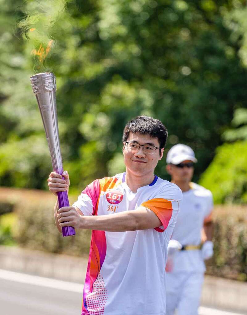 ↑火炬手王懿律在火炬传递中。