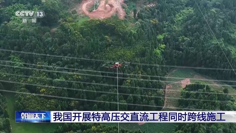 在施工现场,工作人员操作无人机,带着牵引绳缓缓升空,在140米的高空,带动重量达到6吨的导线,缓缓跨过500千伏嘉林线上空,最终架设在两基170多米高、间距400米的铁塔间。据了解,这次跨越施工,是利用四川电网500千伏嘉林线停电检修窗口期,实现只停一次电,完成川渝特高压、金上至湖北特高压两项工程的三个作业区段同时跨越放线。这样可以最大程度减少停电时间。