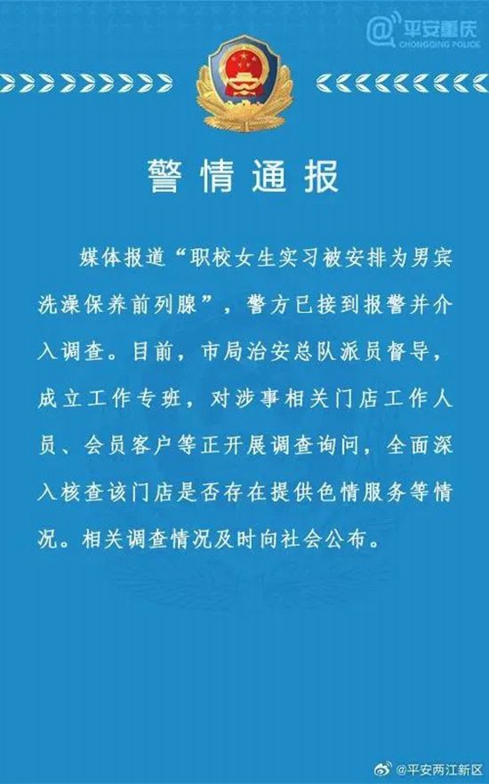 媒体报道“职校女生实习被安排为男宾洗澡保养前列腺”,警方已接到报警并介入调查。