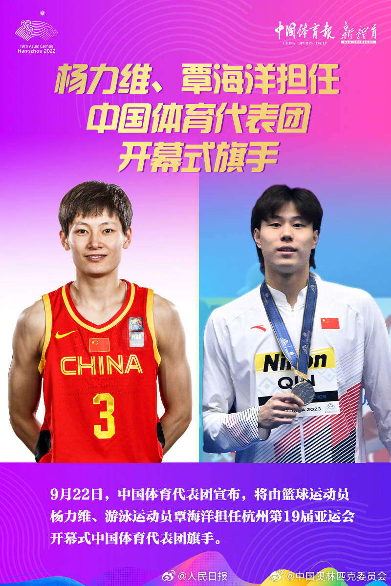 9月22日上午,中国体育代表团宣布,将由游泳运动员覃海洋和篮球运动员杨力维担任杭州亚运会开幕式中国体育代表团旗手。