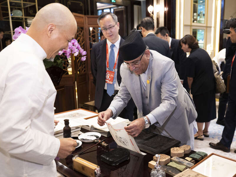 这是尼泊尔总理普拉昌达体验非遗项目。