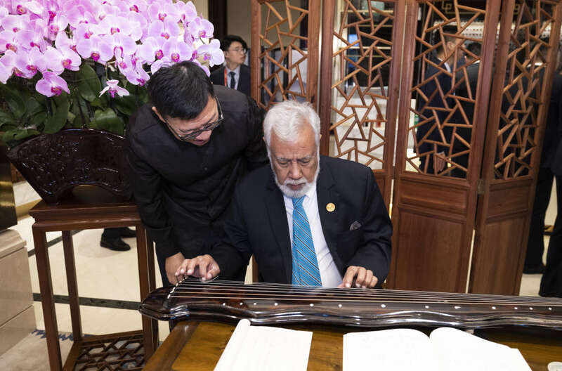 9月23日中午,国家主席习近平和夫人彭丽媛在浙江省杭州市西子宾馆举行宴会,欢迎来华出席杭州第19届亚洲运动会开幕式的国际贵宾。欢迎宴会开始前,贵宾们欣赏了浙江非物质文化遗产展示。