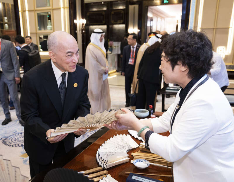 这是柬埔寨国王西哈莫尼欣赏非遗展示。