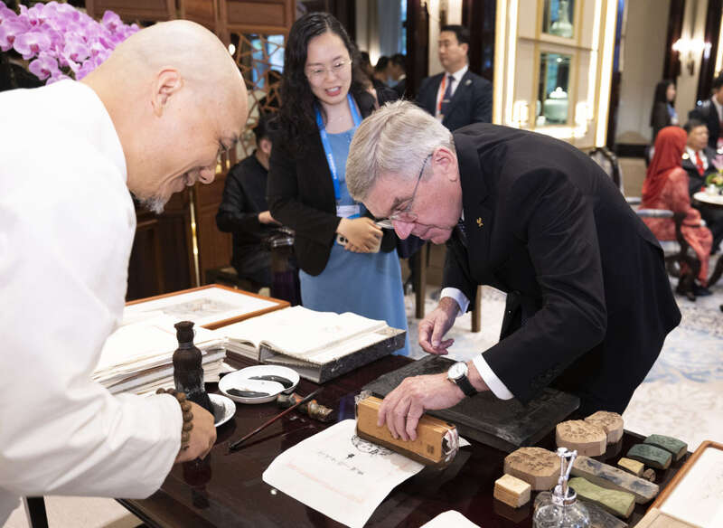 这是国际奥委会主席巴赫体验非遗项目。