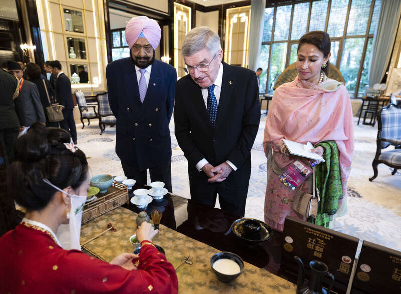 这是亚奥理事会代理主席辛格和夫人维尼塔、国际奥委会主席巴赫欣赏非遗展示。