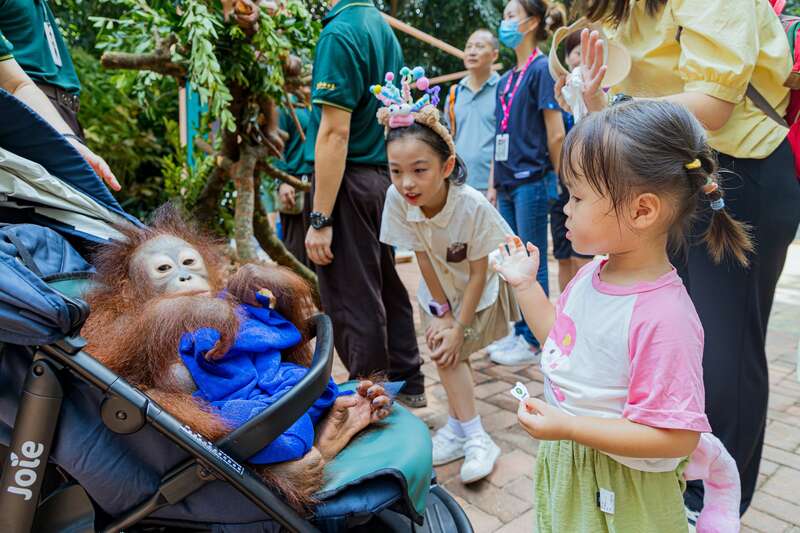 小朋友与红毛猩猩宝宝互动。邓泳怡/摄