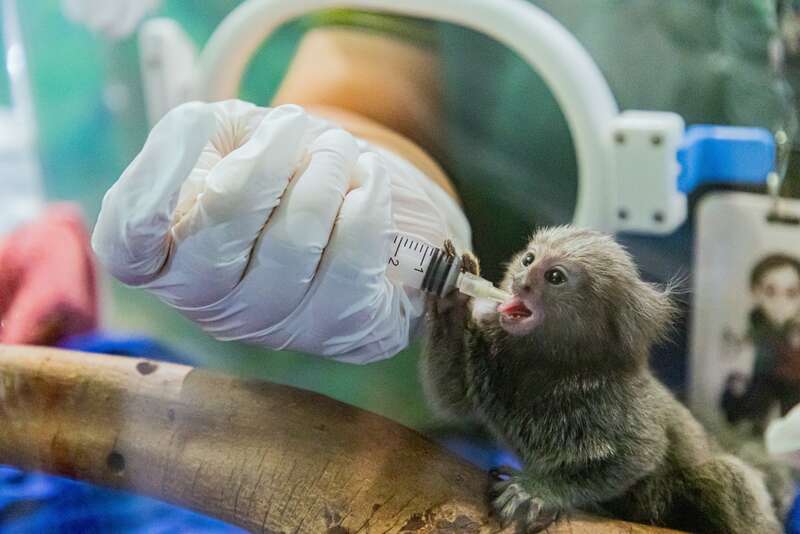保育员喂养狮面绒猴。邓泳怡/摄