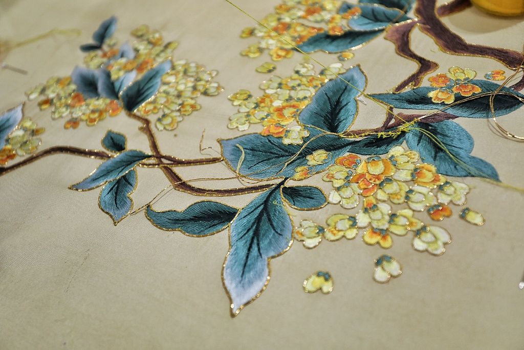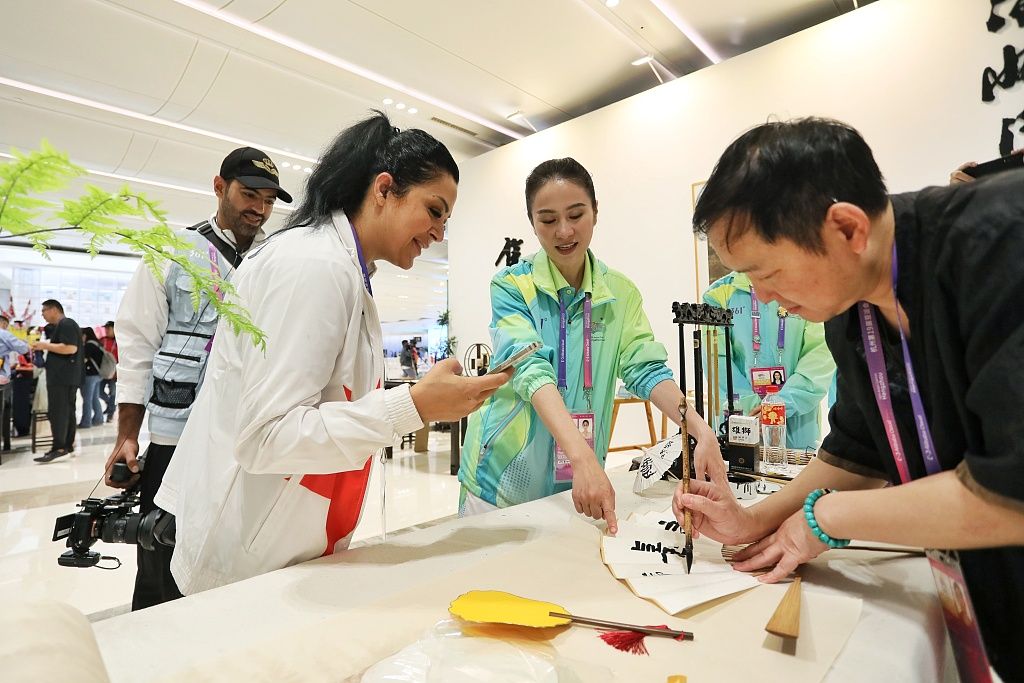 9月23日,杭州亚运会主媒体中心MMC,城市文化展厅展示区展示了丝绸、瓷器、茶具、古装等中国传统文化展品。