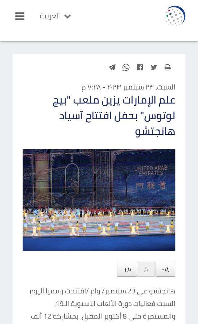 同样在23日,阿联酋国家通讯社(Emirates News Agency)发表题为《阿联酋国旗点缀杭州亚运会“大莲花”体育场》的报道。报道称,中国国家主席习近平当晚宣布了亚运会的开幕。杭州亚运会的开幕式精彩纷呈,突出展现了主办国的文化遗产,重点关注可持续发展和环境保护领域的实践,同时凸显古代文明独有的特征。杭州亚运会的举办正是收获果实、收获喜悦的时刻,东道主将与亚洲各国来宾共同分享。