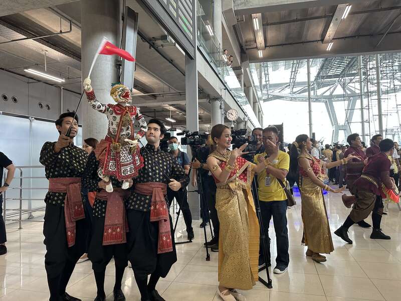 曼谷素万纳普国际机场举办了隆重、热情的欢迎仪式,迎接中国游客的到来。泰国总理赛塔、泰国旅游与体育部部长素妲婉、泰国国家旅游局局长塔佩妮、中国驻泰国大使韩志强等出席欢迎仪式,并为游客赠送精美伴手礼。