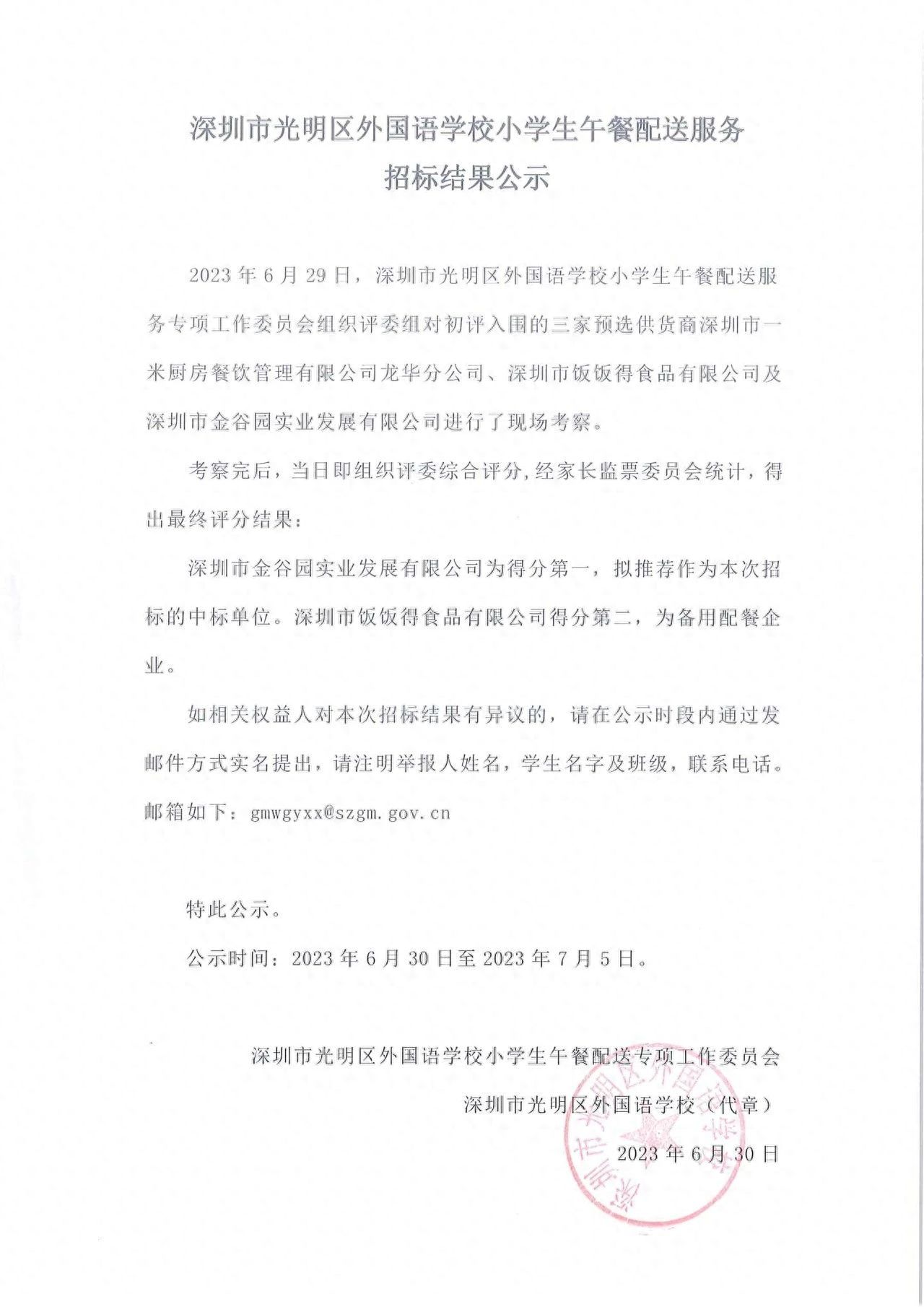 该校2023年7月3日发布的小学生午餐配送服务招标结果公示显示,经过考察、评分,深圳市金谷园实业发展有限公司得分第一,为中标单位。