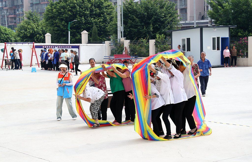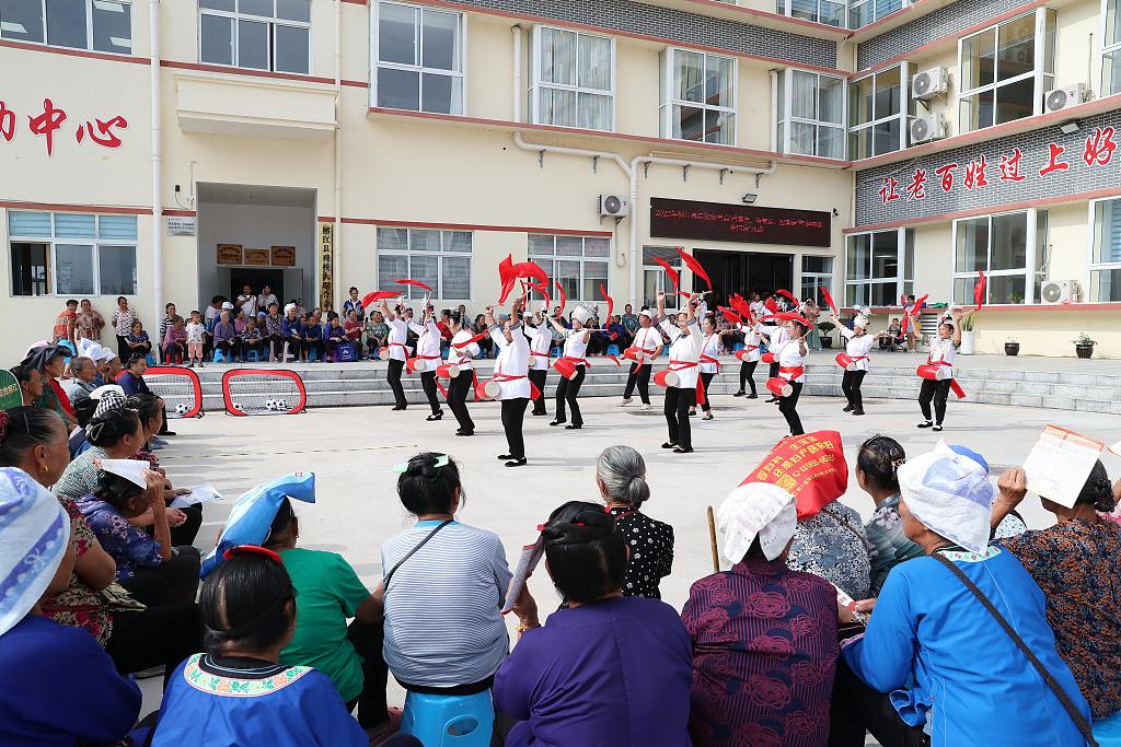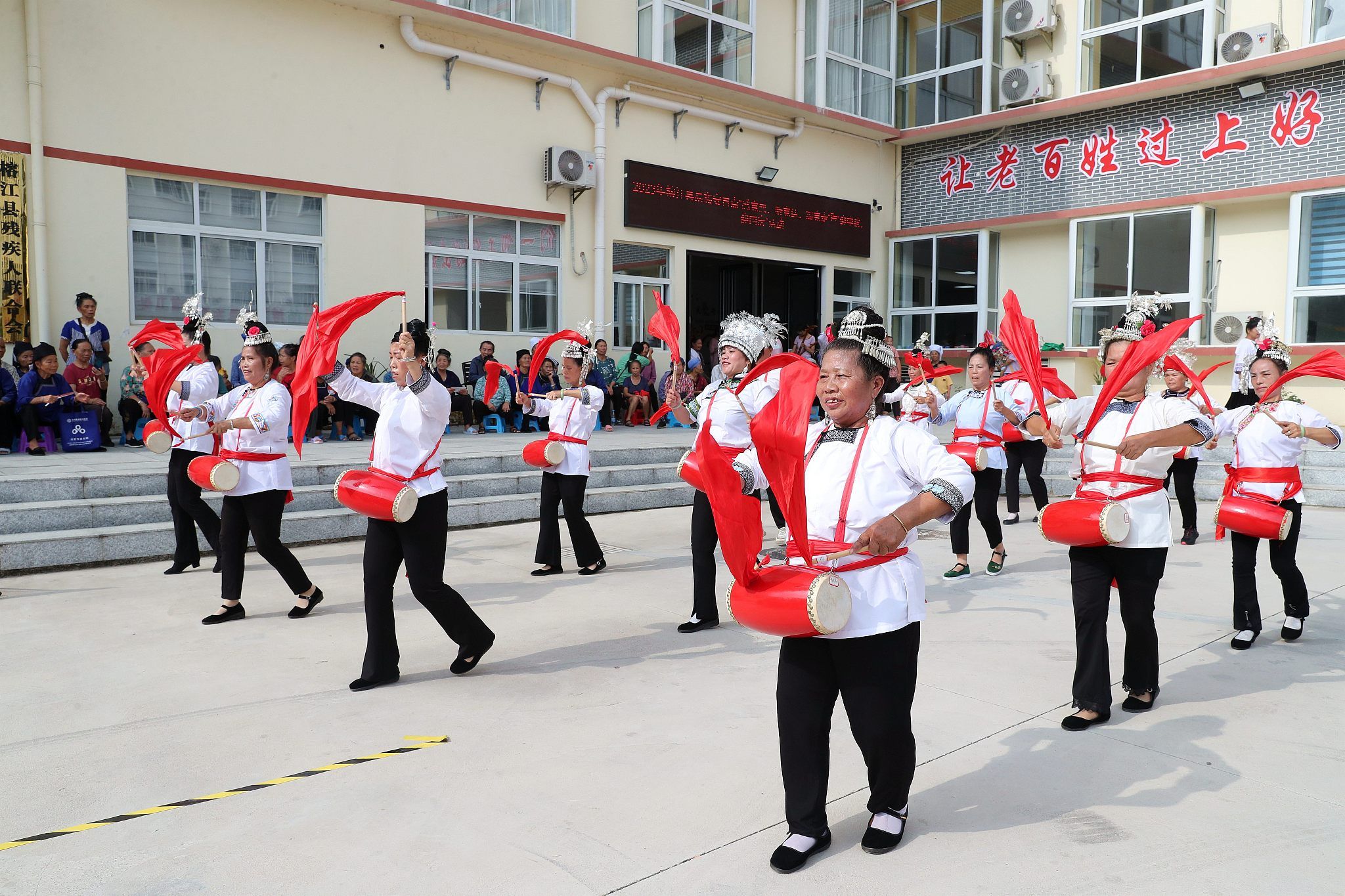 9月26日,贵州省黔东南苗族侗族自治州,榕江县车民街道移民安置点,新市民在表演腰鼓舞。
