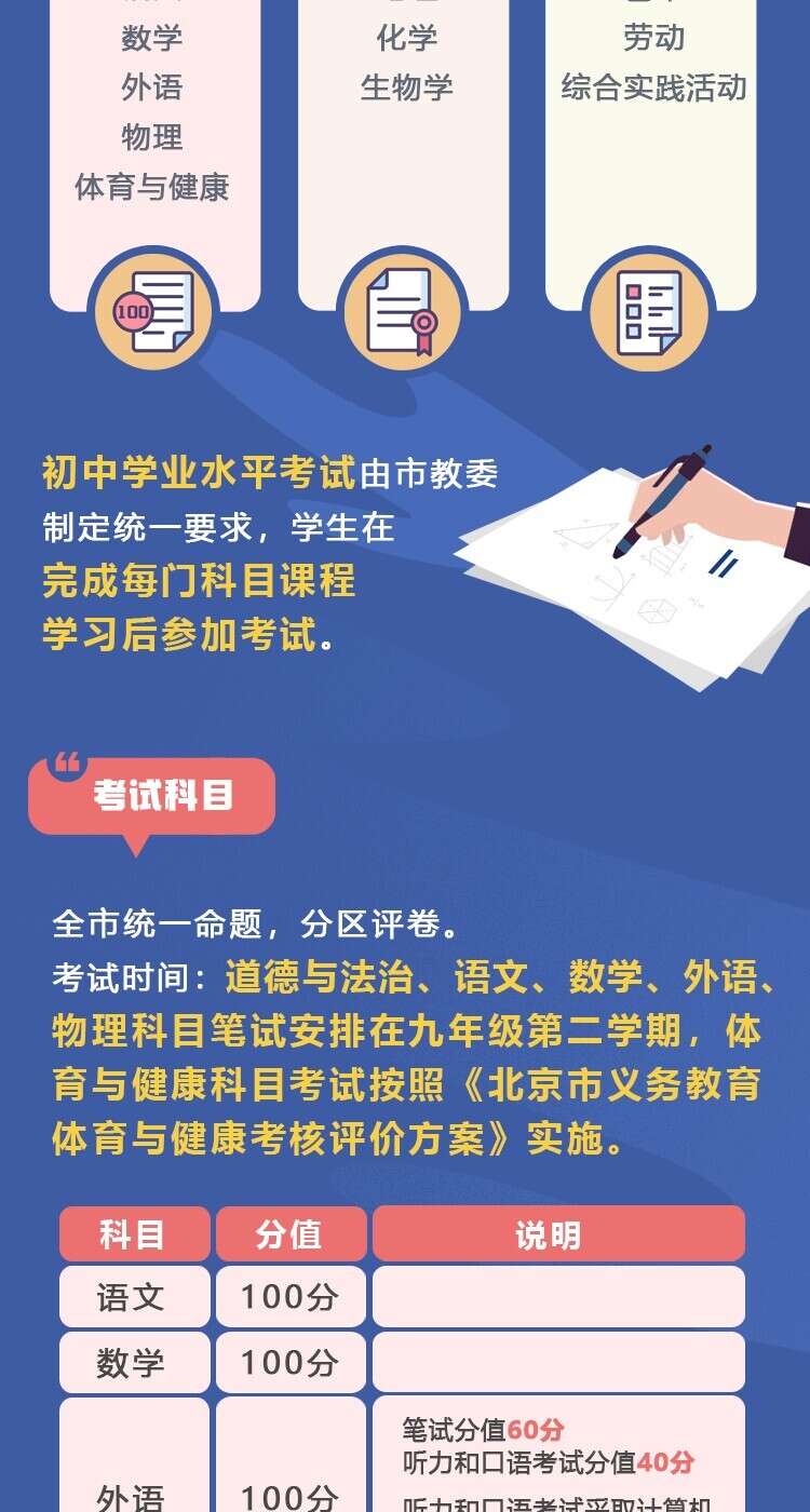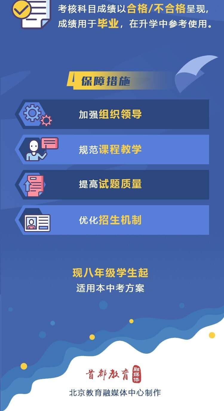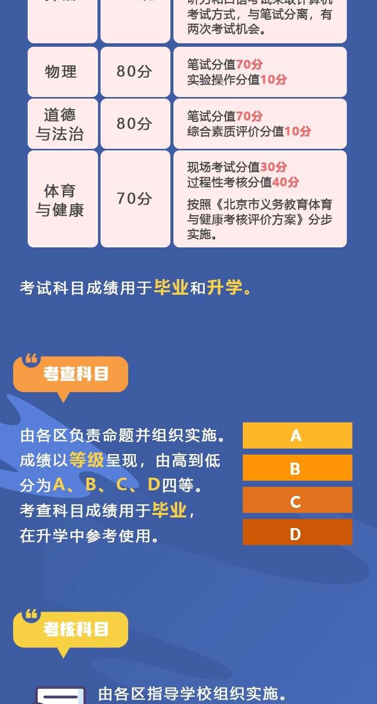 政策发布后,北京市初中学业水平考试实施办法,明确规定考试时间、成绩呈现方式,以及实验操作测试方案,制定道德与法治科目成绩中计入初中学生综合素质评价相关结果的实施细则等。