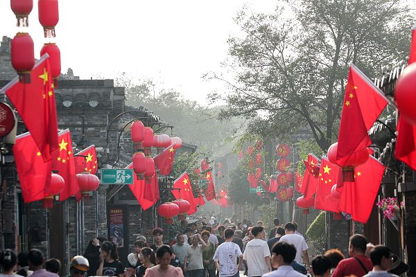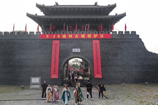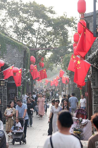 9月27日,江苏扬州,东关历史街区的街头装扮一新,鲜艳的五星红旗与鳞次栉比的古建筑相互辉映,营造出喜庆祥和、隆重热烈的节日氛围。