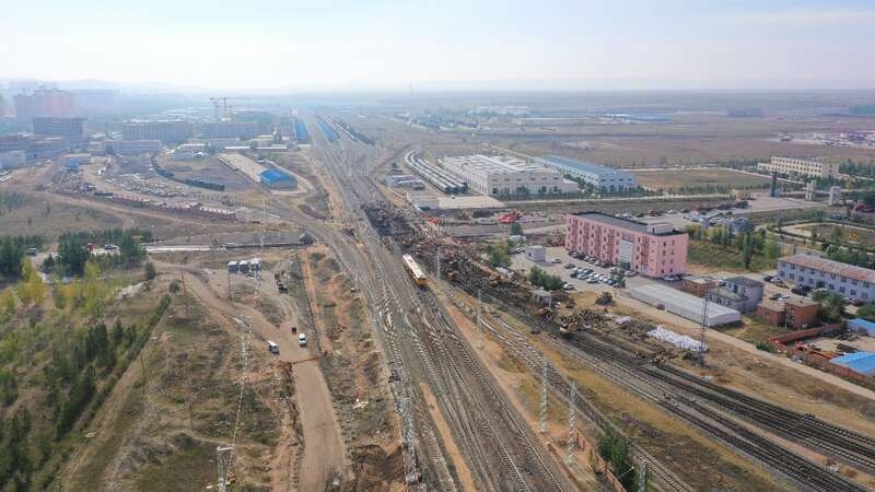 9月25日,太锡铁路锡林浩特站施工现场。(无人机航拍)