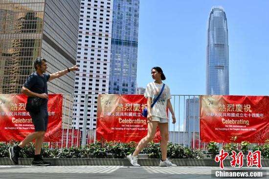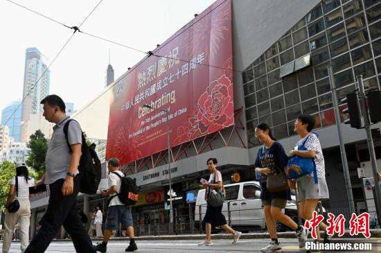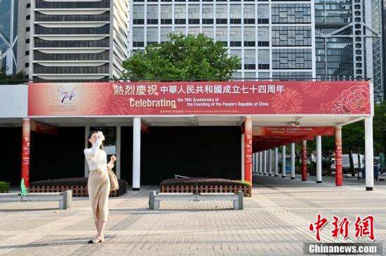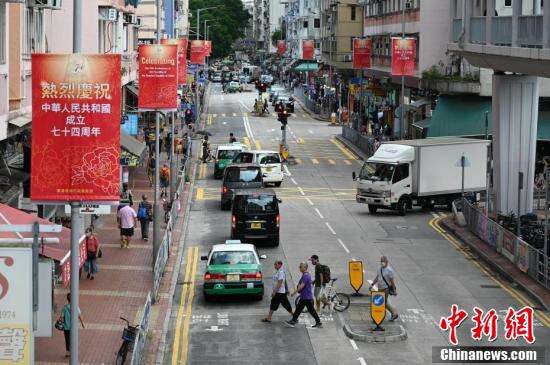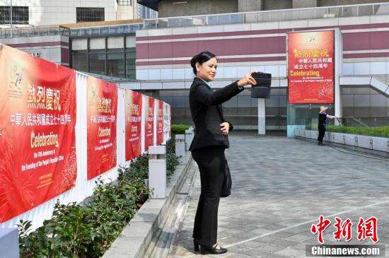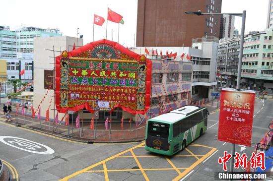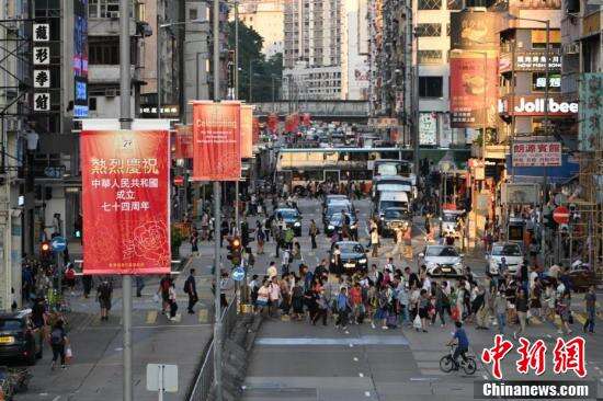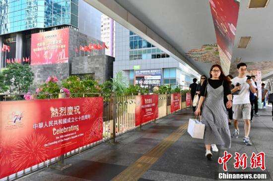 国庆临近,9月27日香港湾仔、金钟、北角、坚尼地城、筲箕湾、旺角、元朗一带贴有庆国庆横幅或竖幅,迎接国庆。图为湾仔街头的庆国庆横幅。